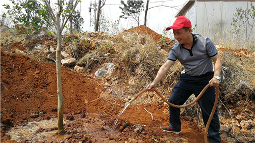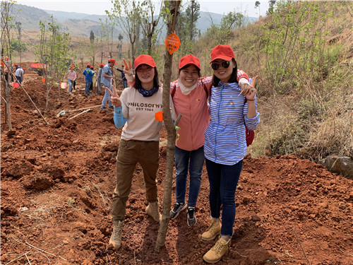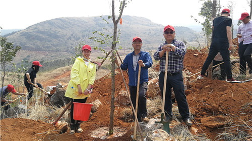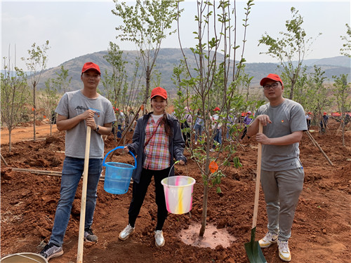 在專業(yè)綠化師傅示范植樹的方法和步驟后。大家在公司工會主席胡云紅的組織下,迅速分為三人一隊,領(lǐng)取鐵鍬、鋤頭、水桶等工具,各自尋找目標(biāo),在高差十來米的坡上、坡下兩個種植點,大家分工協(xié)作,填土、撐桿、澆水,用了一個多小時種完了136棵冬櫻花、100棵玉蘭花。并給每棵樹都掛上了簽著自己名字的責(zé)任牌。